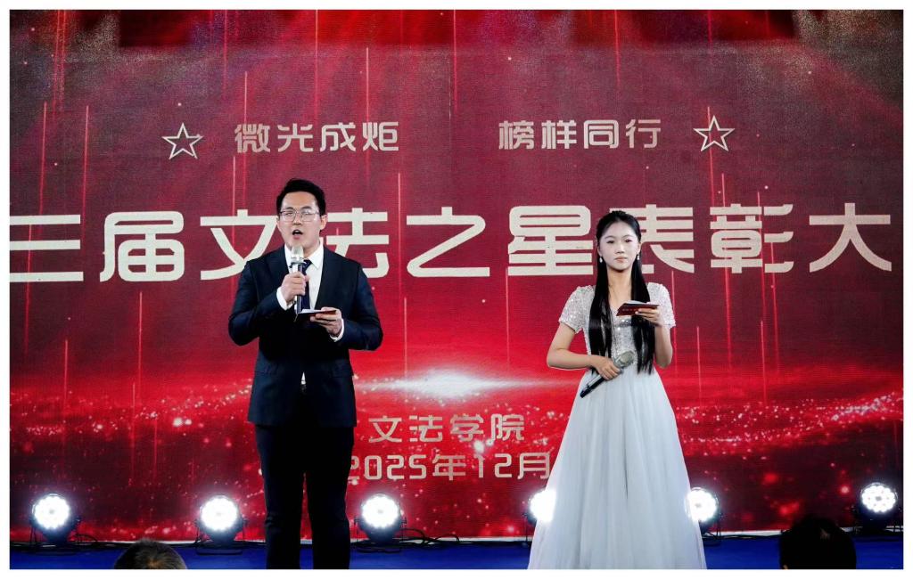 为表彰先进典型,凝聚奋进力量,2025年12月25日下午,太阳成集团tyc151cc在开发区校区综合楼报告厅举办“微光成炬,榜样同行”第三届文法之星表彰大会,校党委副书记王松出席大会并讲话。校党委宣传部、党委学工部、教务处、科研处、太阳成集团处、校团委、马克思主义学院主要负责同志出席会议。太阳成集团tyc151cc全体教师、学生代表、校友代表、家长代表千余人通过线上线下共同观看表彰会。